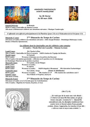 Article publié par response.text()) .then(text => { html = text showLoading = false; })" class="flex justify-center animate-grow-on-hover--small">Cathocambrai • Publié le Samedi 28 février 2026 - 16h11 • 4 visites 2609 annonces paroissiales du 28 fev au 8 mars 202 Télécharger 319.1 Ko Télécharger