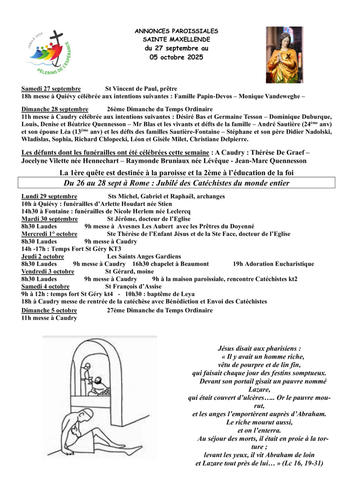 Article publié par response.text()) .then(text => { html = text showLoading = false; })" class="flex justify-center animate-grow-on-hover--small">Cathocambrai • Publié le Mercredi 01 octobre 2025 - 11h51 • 9 visites 2540 annonces paroissiales du 27 septembre au 05 o Télécharger 252 Ko Télécharger