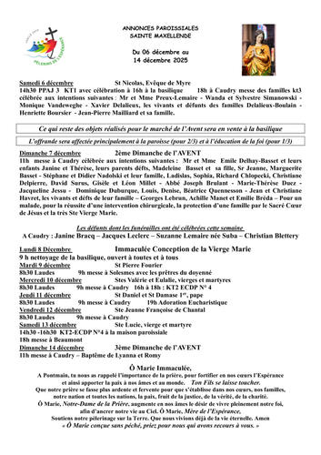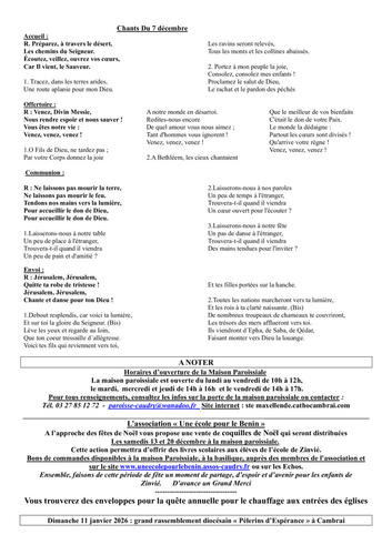 Article publié par response.text()) .then(text => { html = text showLoading = false; })" class="flex justify-center animate-grow-on-hover--small">Cathocambrai • Publié le Samedi 06 décembre 2025 - 15h10 • 10 visites 2550 annonces paroissiales du 6 au 14 decembre 202 Télécharger 231.4 Ko Télécharger