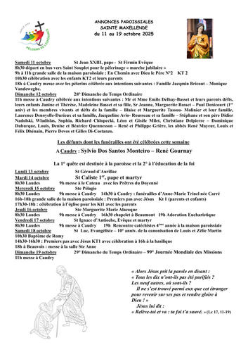Article publié par response.text()) .then(text => { html = text showLoading = false; })" class="flex justify-center animate-grow-on-hover--small">Cathocambrai • Publié le Samedi 11 octobre 2025 - 16h00 • 8 visites 2542 annonces paroissiales du 11 au 19 octobre 202 Télécharger 272.5 Ko Télécharger
