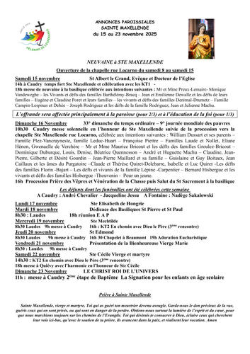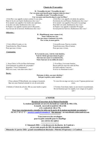 Article publié par response.text()) .then(text => { html = text showLoading = false; })" class="flex justify-center animate-grow-on-hover--small">Cathocambrai • Publié le Samedi 15 novembre 2025 - 10h21 • 4 visites 2547 annonces paroissiales du 15 au 23 novembre 20 Télécharger 234.3 Ko Télécharger