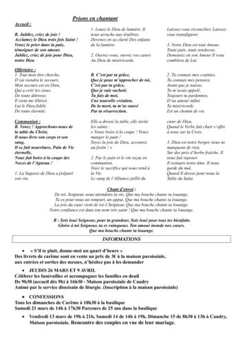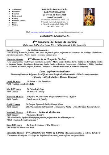 Article publié par response.text()) .then(text => { html = text showLoading = false; })" class="flex justify-center animate-grow-on-hover--small">Cathocambrai • Publié le Samedi 14 mars 2026 - 14h57 • 3 visites 2611 annonces paroissiales du 14 au 22 mars 2026 Télécharger 289.2 Ko Télécharger