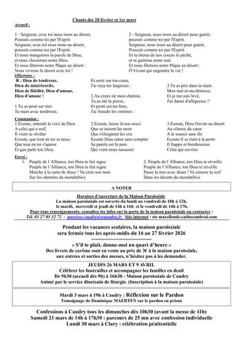 Article publié par response.text()) .then(text => { html = text showLoading = false; })" class="flex justify-center animate-grow-on-hover--small">Cathocambrai • Publié le Samedi 21 février 2026 - 17h29 • 8 visites 2608 annonces paroissiales du 21 fev au 1e mars 20 Télécharger 265.1 Ko Télécharger