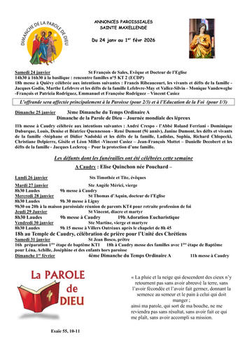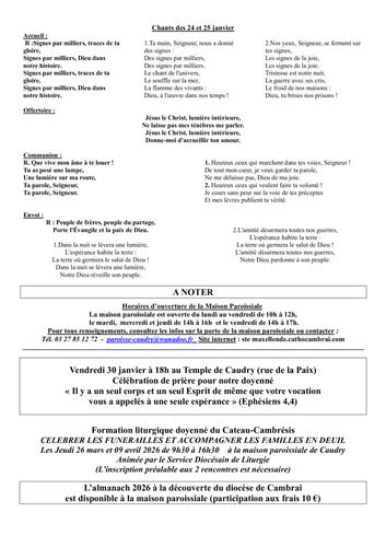 Article publié par response.text()) .then(text => { html = text showLoading = false; })" class="flex justify-center animate-grow-on-hover--small">Cathocambrai • Publié le Samedi 24 janvier 2026 - 11h04 • 19 visites 2604 annonces paroissiales du 24 janv au 1er fevri Télécharger 255.6 Ko Télécharger