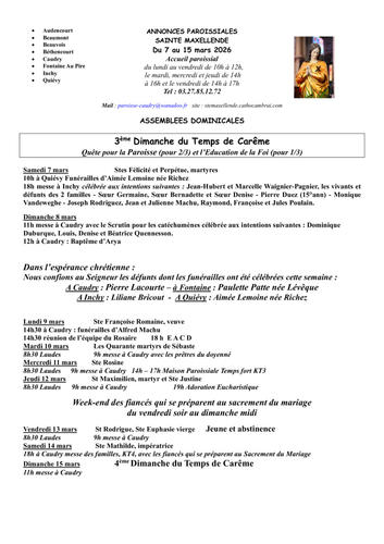 Article publié par response.text()) .then(text => { html = text showLoading = false; })" class="flex justify-center animate-grow-on-hover--small">Cathocambrai • Publié le Dimanche 08 mars 2026 - 10h31 • 17 visites 2610 annonces paroissiales du 7 au 15 mars 2026 Télécharger 280.4 Ko Télécharger